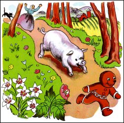down the lane he sped when he came to a pig. 'stop! stop! i would like to eat you," shouted the pig. the gingerbread man was too fast. he ran on saying "run, run as fast as you can. you can't catch me, i'm the gingerbread man.”
