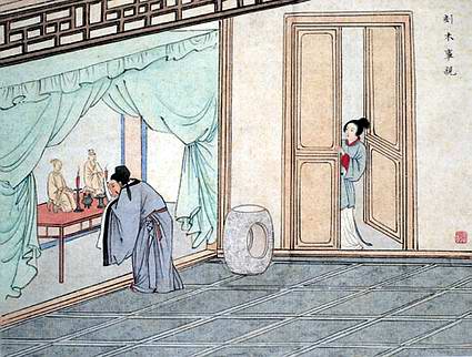 Blood ran out of the fingers of the wood sculptures unexpectedly. When Ding Lan returned home, he saw tears in the eyes of the sculptures. He got to know the fact from his wife and then repudiated her.